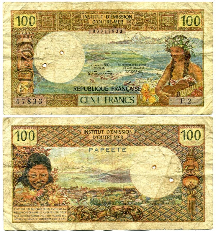 ТАИТИ 100 ФРАНКОВ 1969 Pick 23 бумага 7207-31-2