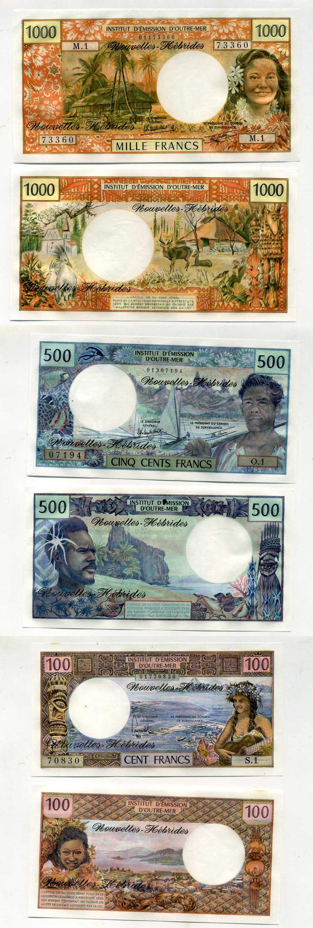 Новые Гебриды набор из 3 банкнот 1977-1980 100 франков, подпись 2, 500 франков, подпись 4 и 1000 франков, подпись 4 Pick 18d, 19с, 20c бумага UNC (пресс) 451-17-1