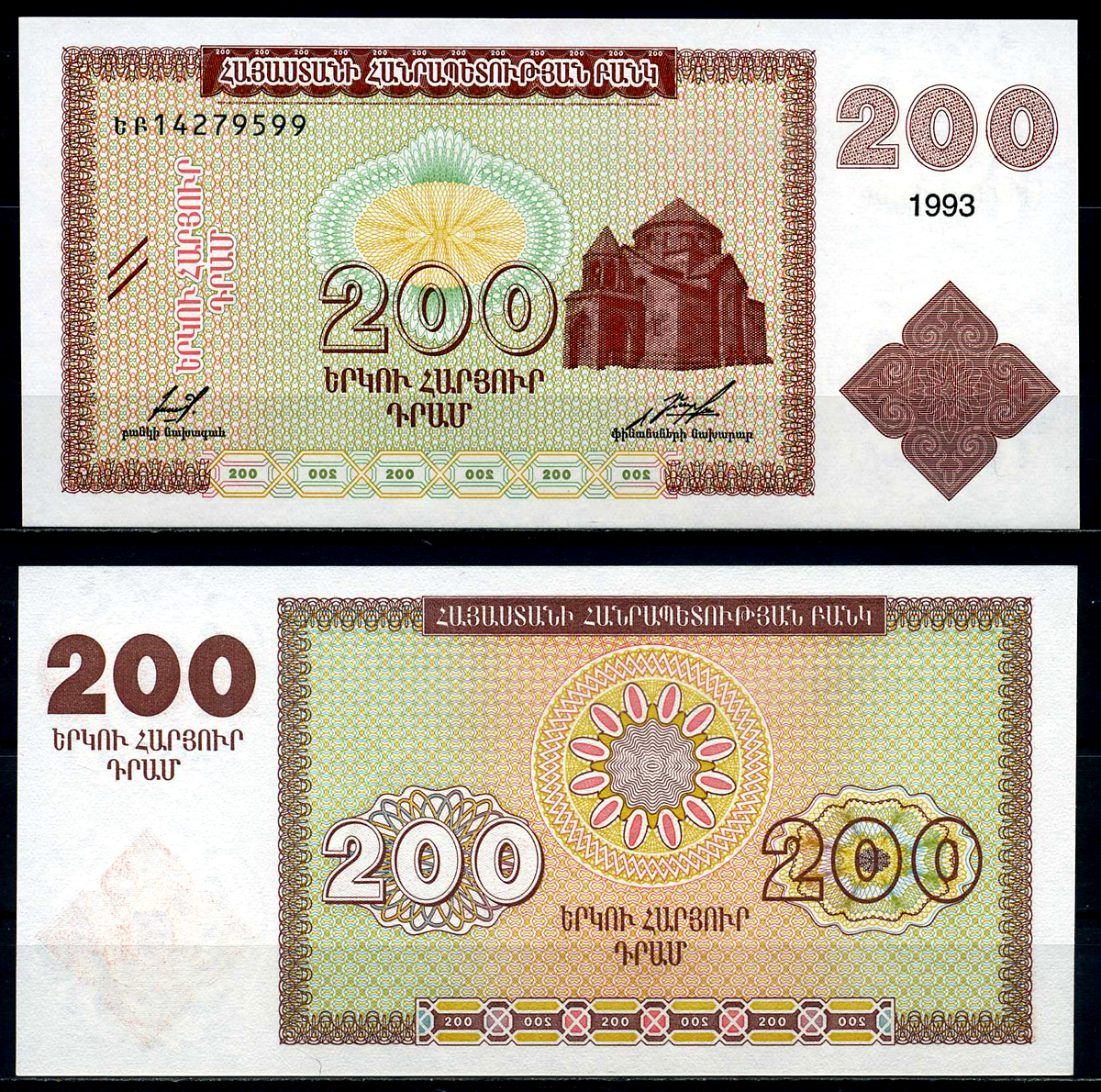 Армения 200 драм 1993 водяной знак герб, Эчмиадзинский монастырь Pick 37 b, Сергеев 5 бумага UNC (пресс) 7201-23-1
