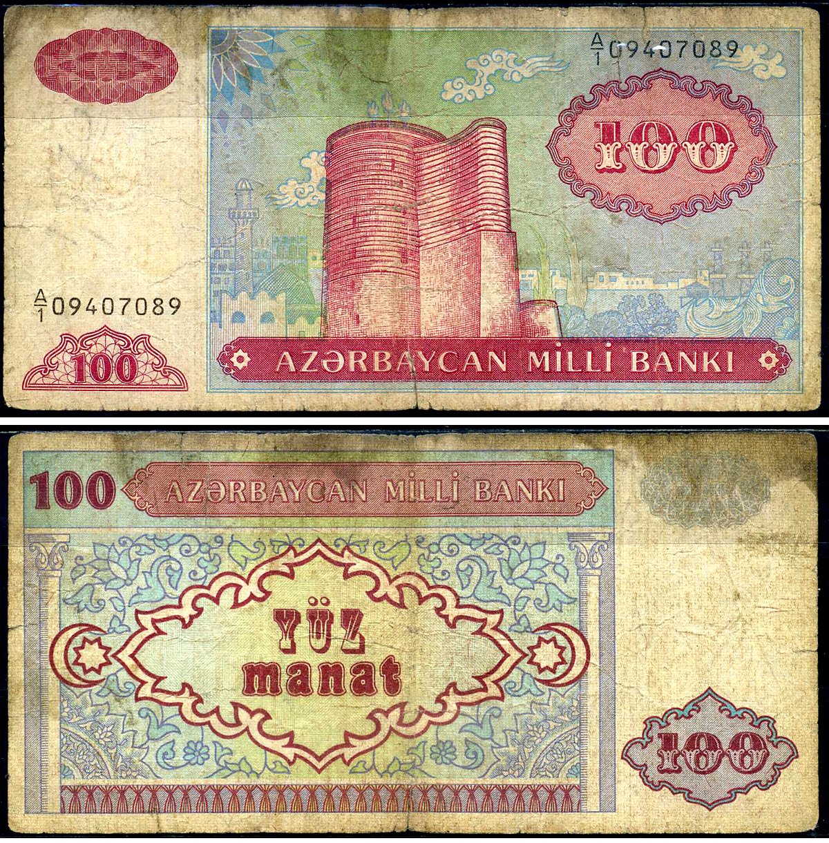 Азербайджан 100 манат 1993 Девичья башня в Баку, дробный номер Pick 18a, Сергеев 8 бумага 8622-24-1-2