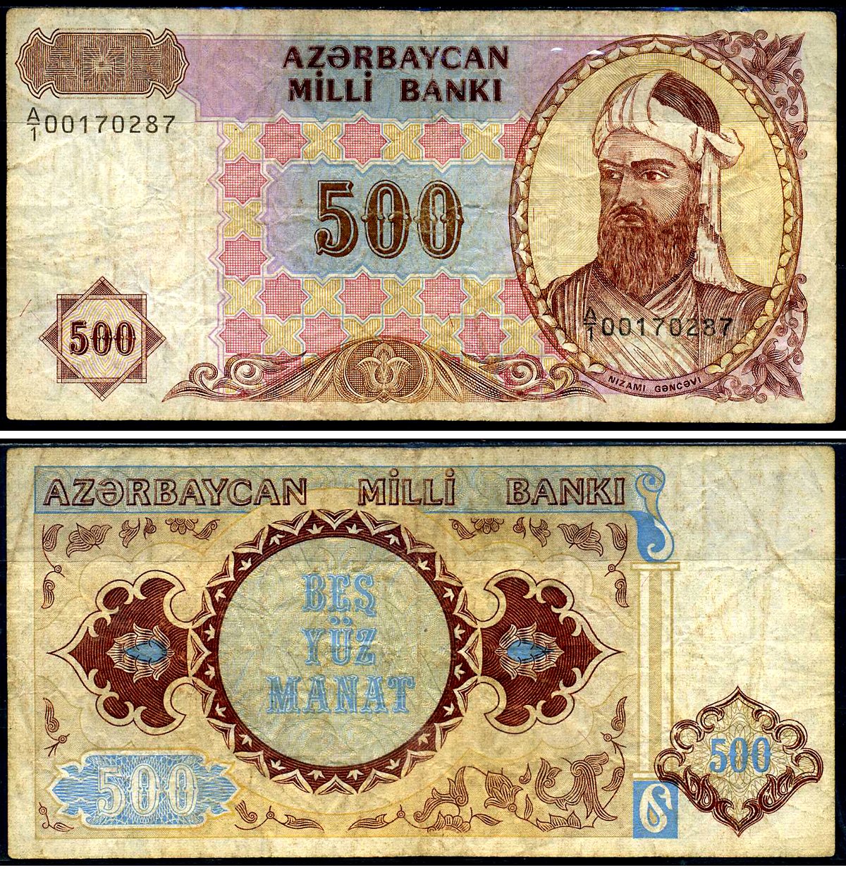 Азербайджан 500 манат 1993 Низами Гянджеви, дробный номер Pick 19a, Сергеев 9 бумага 8622-24-2-2