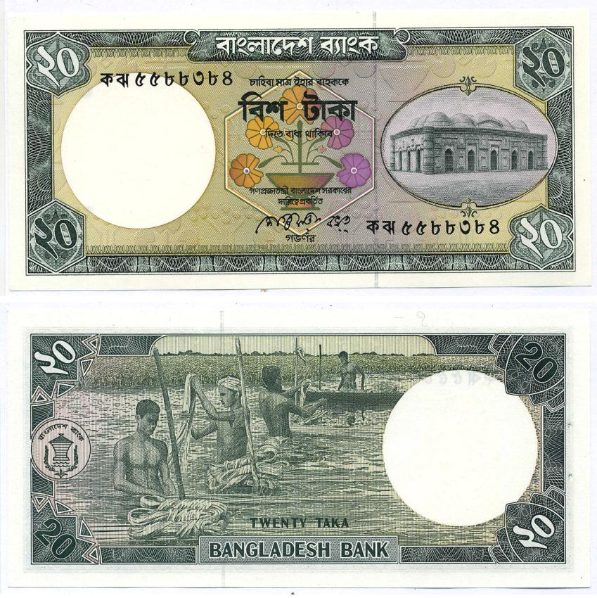 БАНГЛАДЕШ 20 ТАКА 1988 ЧЁРНАЯ ПОДПИСЬ, БОЛЬШАЯ СЕРИЯ, СТЕПЛЕР Pick 27а бумага UNC (ПРЕСС) 8588-61-1-1