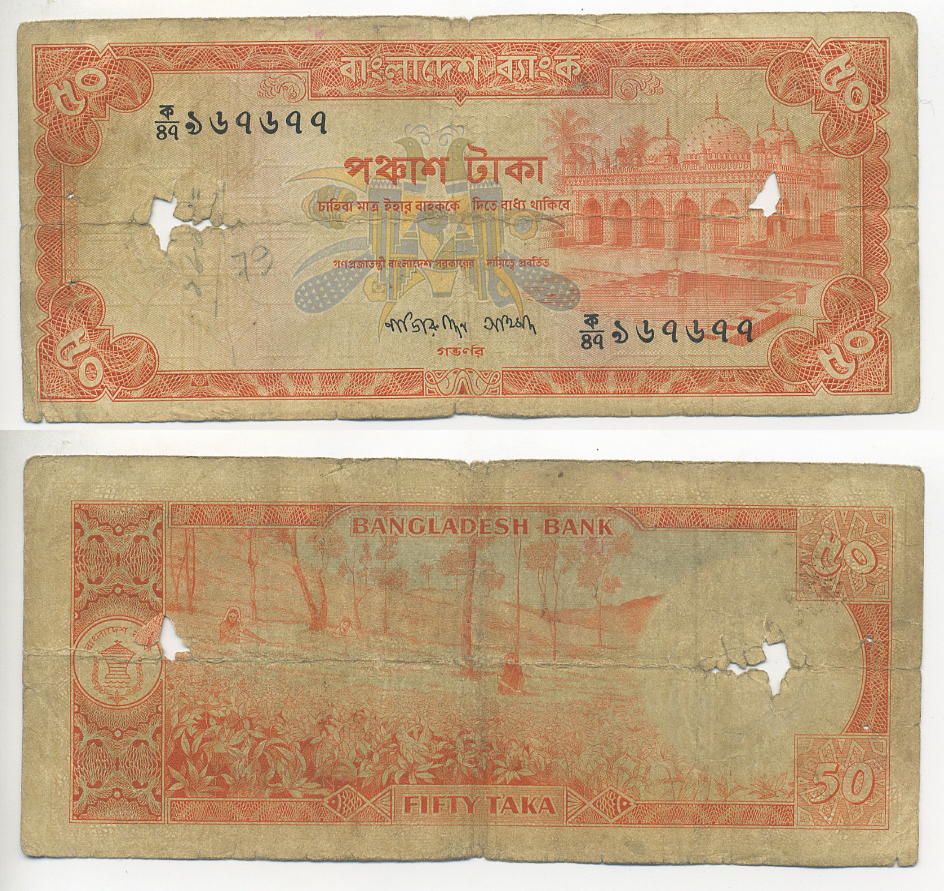 -----БАНГЛАДЕШ 50 ТАКА 1976 ОРАНЖЕВАЯ, ВОДЯНОЙ ЗНАК ГОЛОВА ТИГРА Pick 17а бумага 7221-28-1