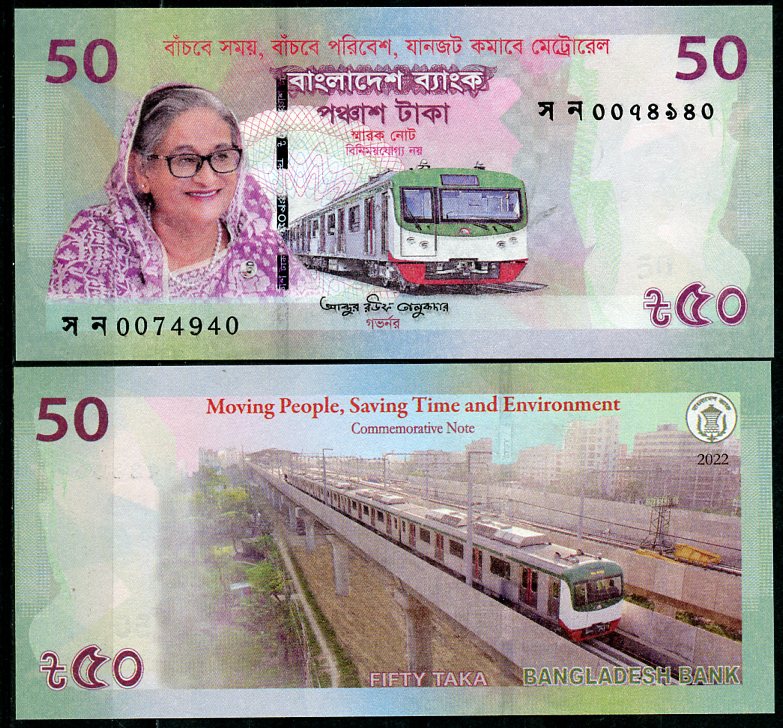 Бангладеш 50 така 2022 Премьер-министр Хасина Ваджед, Даккский метрополитен Pick 72 бумага UNC (пресс) 448-104-1