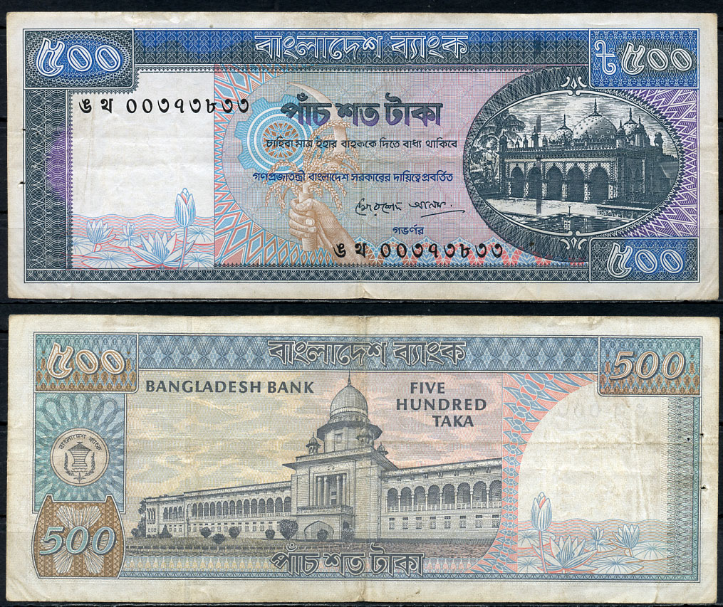 Бангладеш 500 така ND (1982-1995) мечеть звезды, Дакка, 8 цифр в номере Pick 30 c бумага 7548-12-3-1