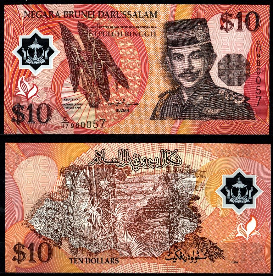 Бруней 10 малайзийских ринггитов 1998 Хассанал Болкиах — султан Брунея, тропический лес Pick 24 b полимер UNC (пресс) 2197-35-1-1