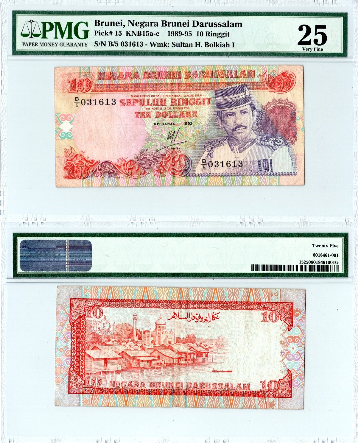 Бруней 10 ринггитов 1992 Султан Хасан аль-Болкиах I, Мечеть Султана Омара Али Сайфуддина, Бандар-Сери-Бегаван, в слабе PMG 25 very fine Pick 15 бумага 452-1-140