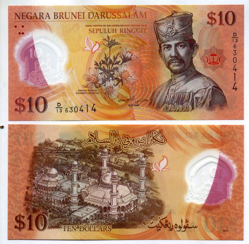 Бруней 10 ринггитов 2011 султан Хассанал Болкиах I (1967-) Pick 37 пластик UNC (пресс) 449-33-3