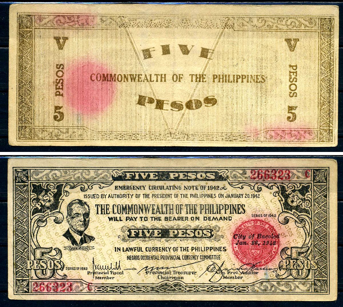 Филиппины 5 песо 1942 Филиппинский Национальный Банк (город Западный Негрос, партизанские деньги) серия D Pick S648 b бумага 7548-95-4-2