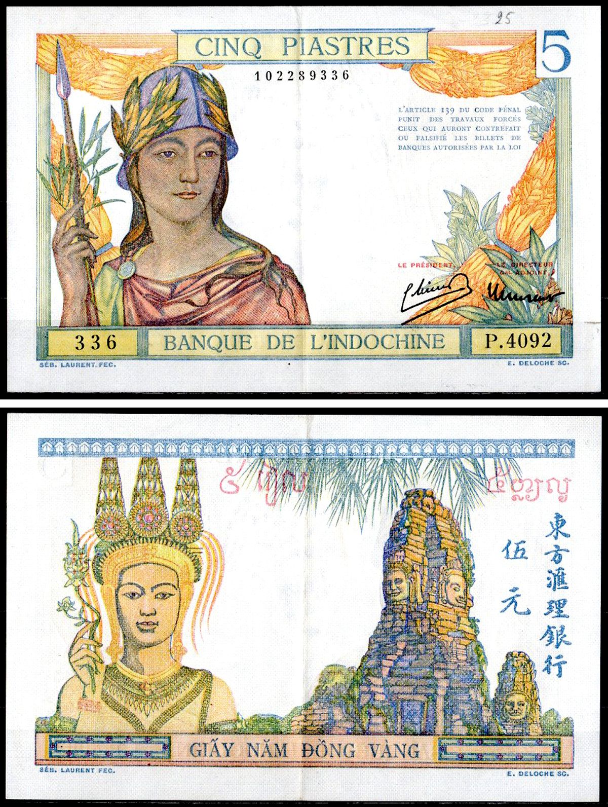 Французский Индокитай 5 пиастров ND (1936-1939) Женщина в шлеме; Четыре лика Бодхисаттвы Авалокитешвары,храм Байон (Ангкор, Камбоджа) Pick 55 c бумага 435-84-1-1