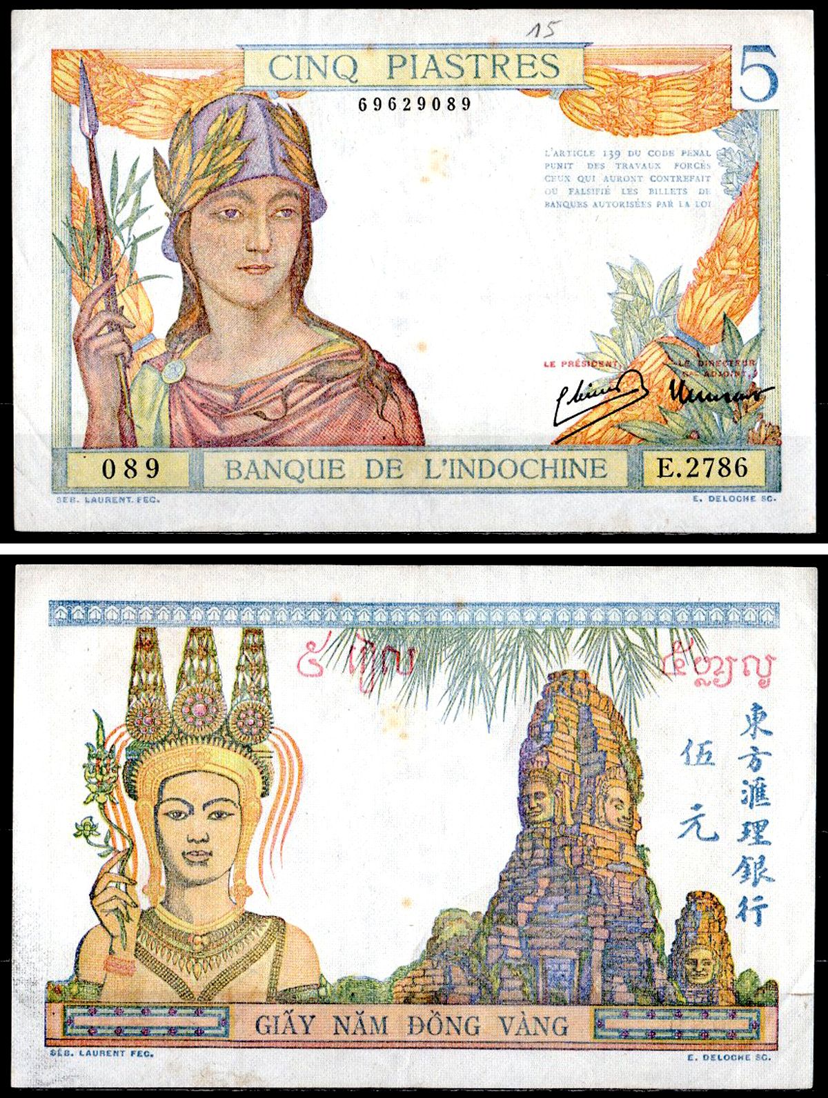 Французский Индокитай 5 пиастров ND (1936-1939) Женщина в шлеме; Четыре лика Бодхисаттвы Авалокитешвары,храм Байон (Ангкор, Камбоджа) Pick 55 c бумага 435-86-1-1