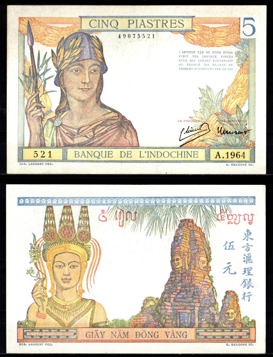 Французский Индокитай 5 пиастров ND (1936-1939) Женщина в шлеме, Четыре лица Бодхисаттвы Авалокитешвары (Бога, который слышит крик мира), храм Байон (Ангкор, Камбоджа) Pick 55 c бумага UNC (пресс) 451-1250-1