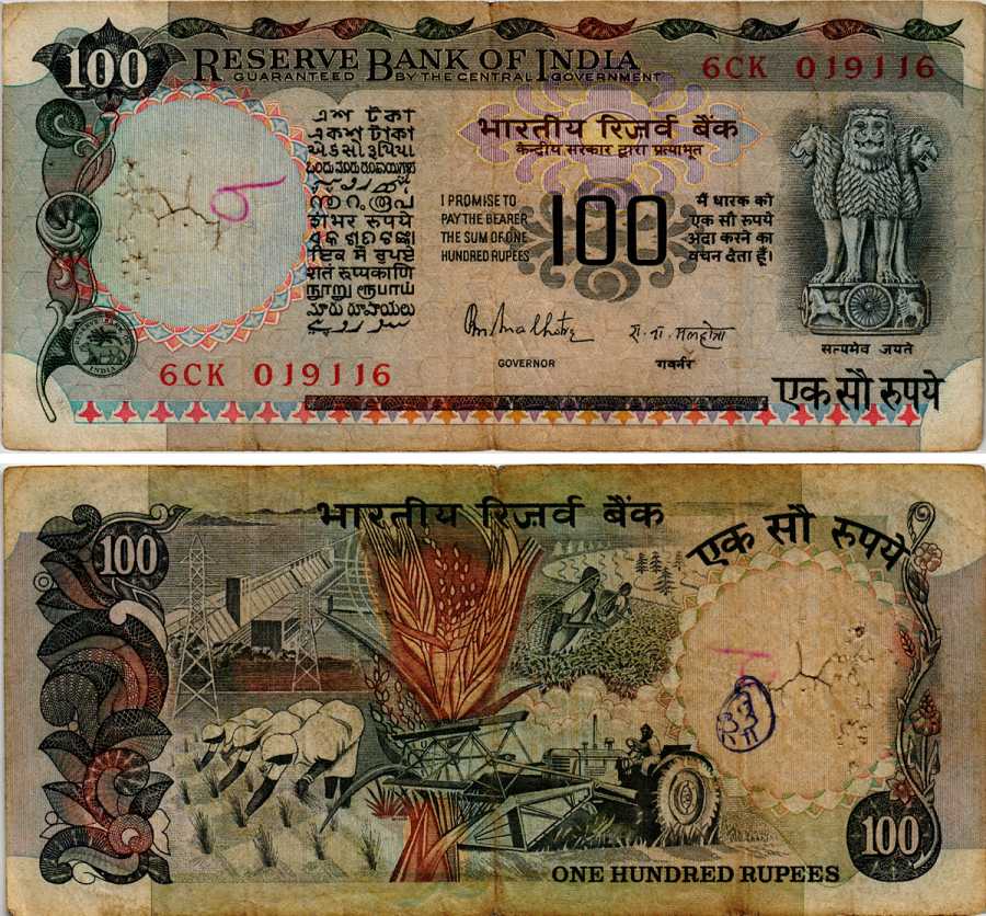 ИНДИЯ 100 РУПИЙ 1978-1979 ПОДПИСЬ 85, ТРАКТОР Pick 85А бумага 6281-43-2-1