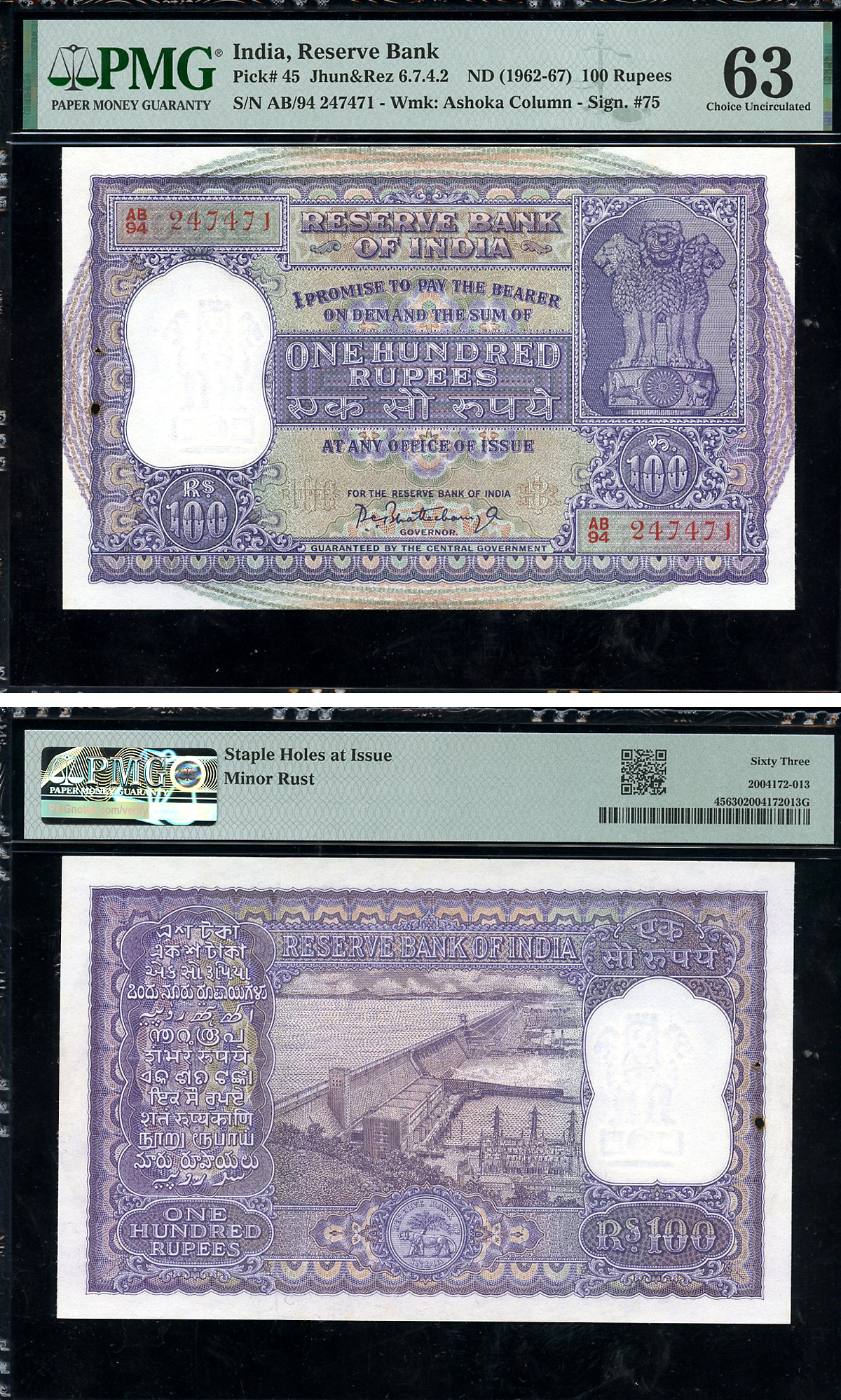 Индия 100 рупий ND (1962-67) плотина Хиракуд (река Маханади, Орисса), в слабе PMG 63 Choice UNC Pick 45 a бумага UNC (пресс) 452-1-03