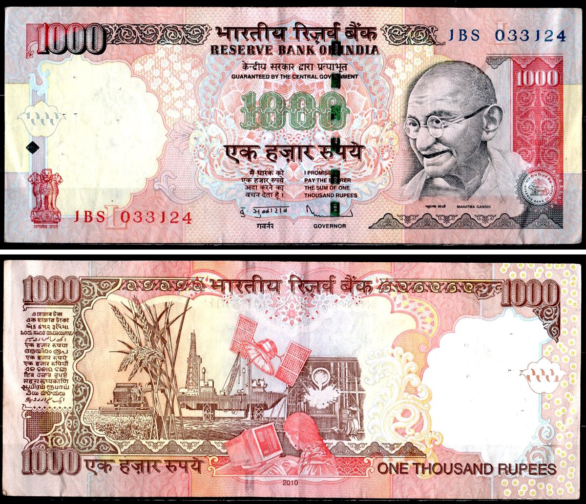 Индия 1000 рупий 2010 Pick 100 q бумага 8595-29-3-1