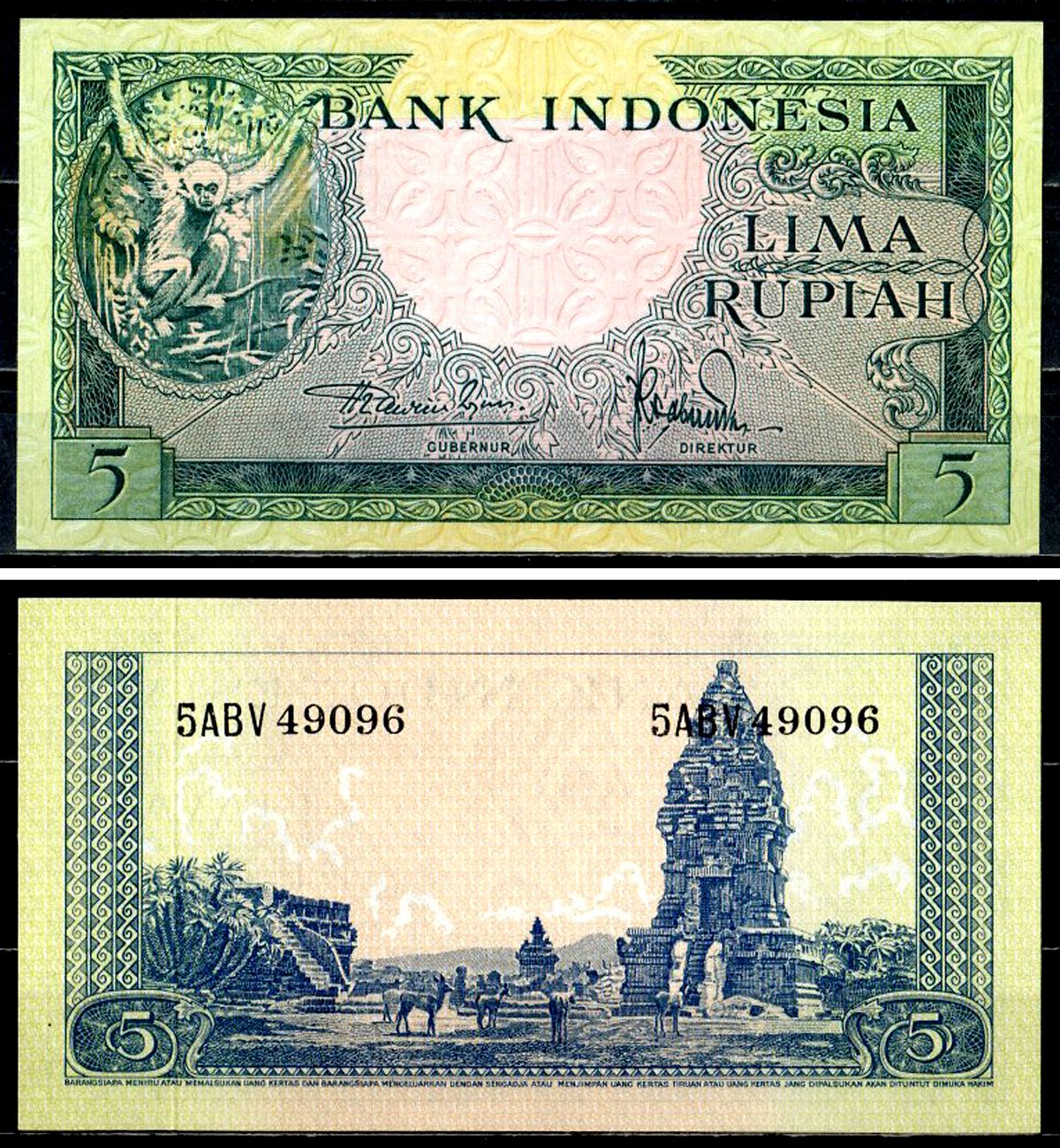 Индонезия 5 рупий ND (1957) Орангутаны, храм Прамбанан Pick 49 бумага UNC (пресс) 451-737-1