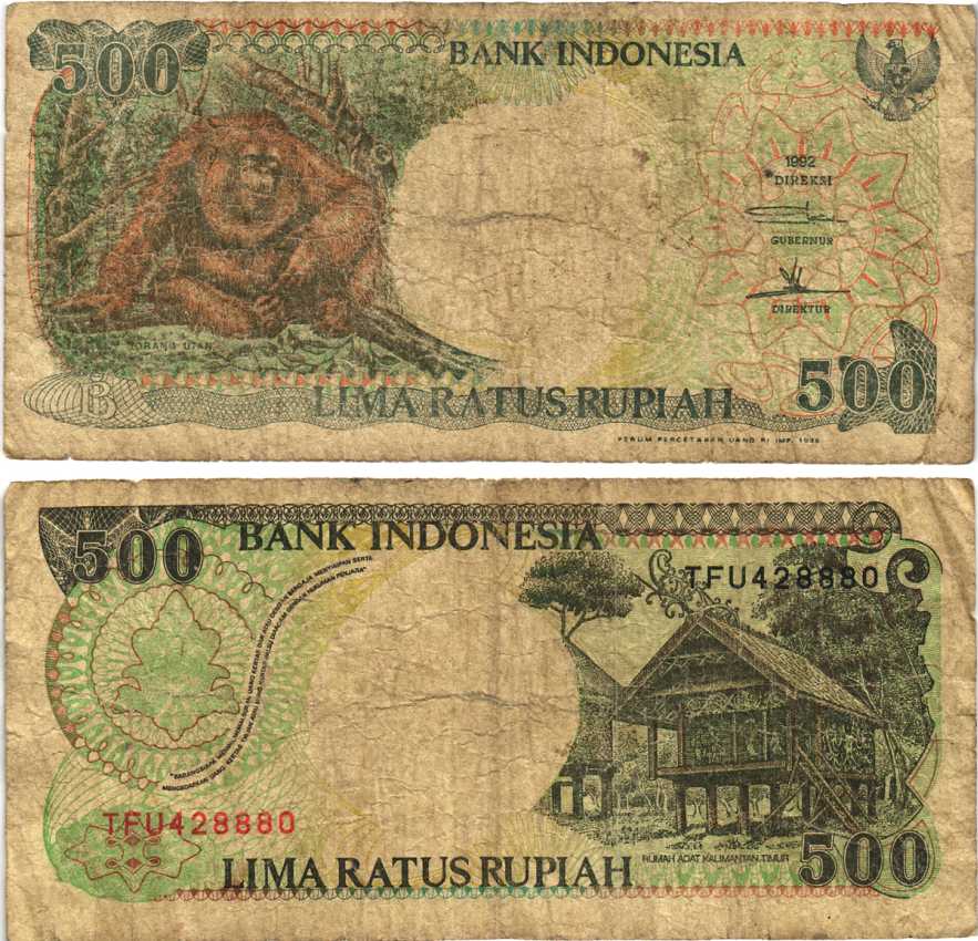 ИНДОНЕЗИЯ 500 РУПИЙ 1992/1996 ОРАНГУТАН, КАЛИМАНТАНСКИЙ ДОМ Pick 128e бумага 7217-25-3-2