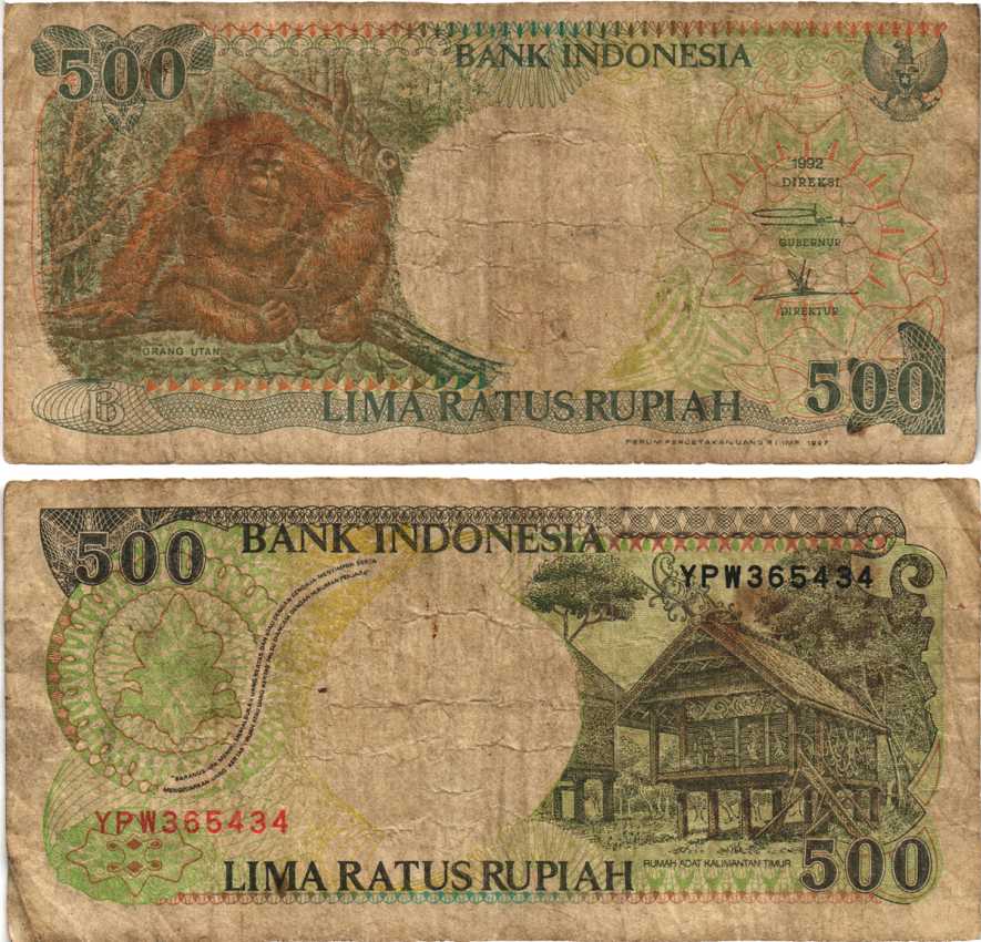 ИНДОНЕЗИЯ 500 РУПИЙ 1992/1997 ОРАНГУТАН, КАЛИМАНТАНСКИЙ ДОМ Pick 128f бумага 7217-29-1-1