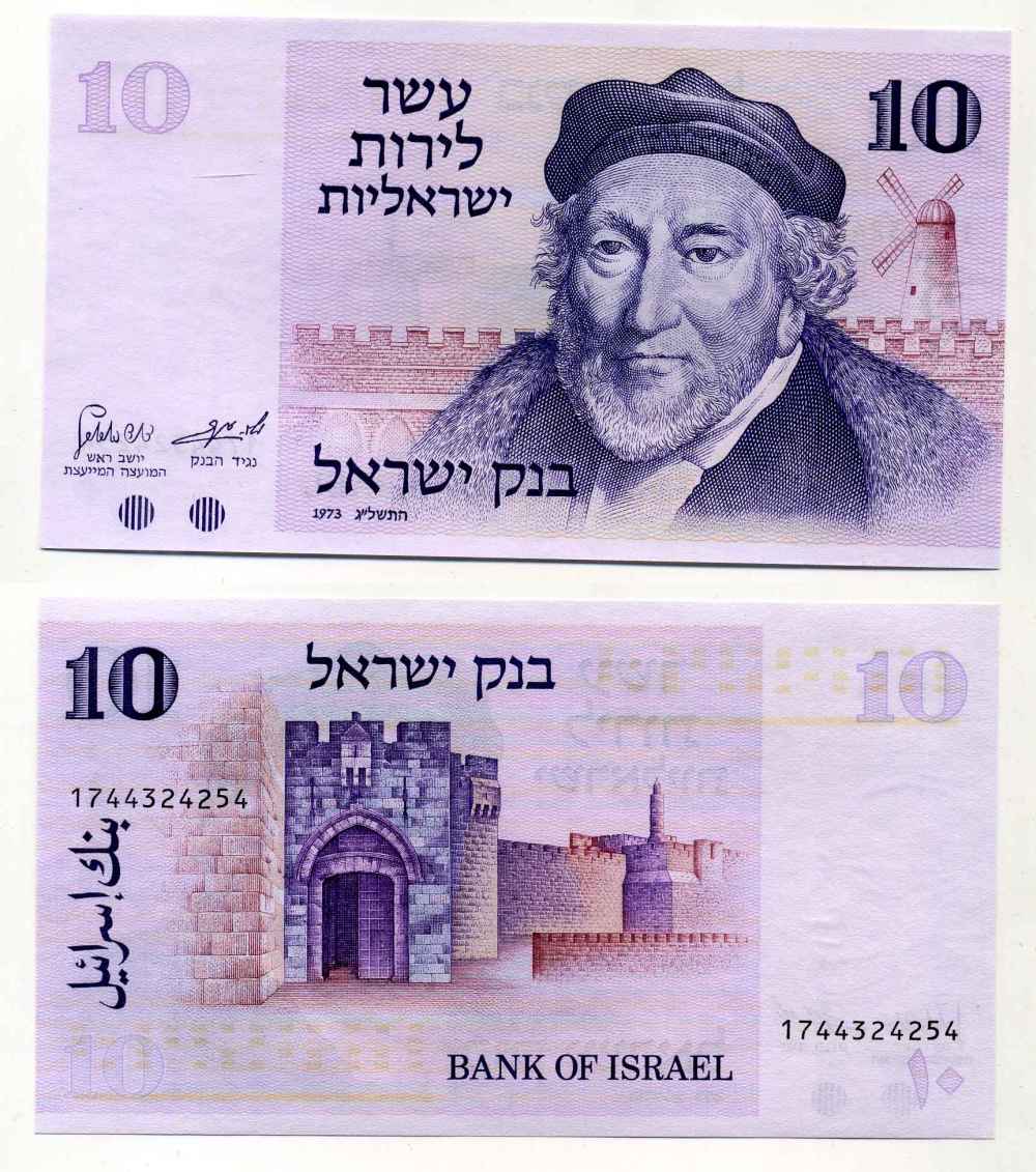Израиль 10 лир 1973 Мозес Монтефиоре, Яффские ворота, Иерусалим Pick 39 a бумага UNC (пресс) 000-00-00