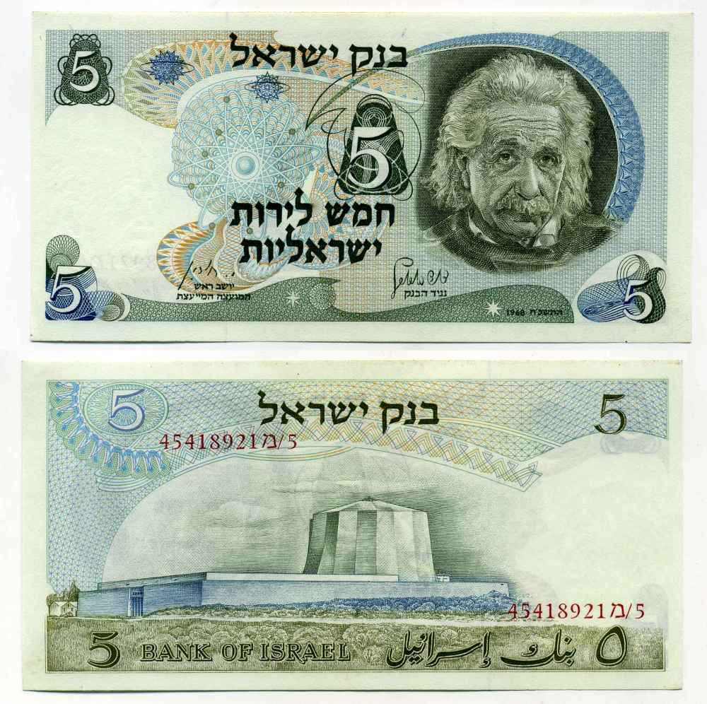 Израиль 5 лир 1968 Альберт Эйнштейн, ядерный реактор, Нахаль Сорек, красная серия Pick 34 b бумага UNC (пресс) 000-00-00