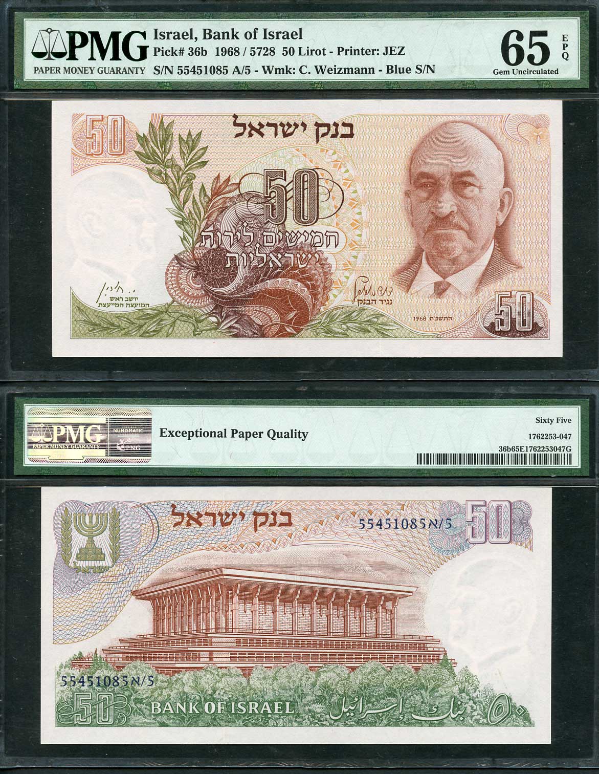 Израиль 50 лир 1968 Хаим Вейцман, здание Кнессета, Иерусалим, голубая серия, в слабе PMG 65 Pick 36 b бумага UNC (пресс) 452-2-29