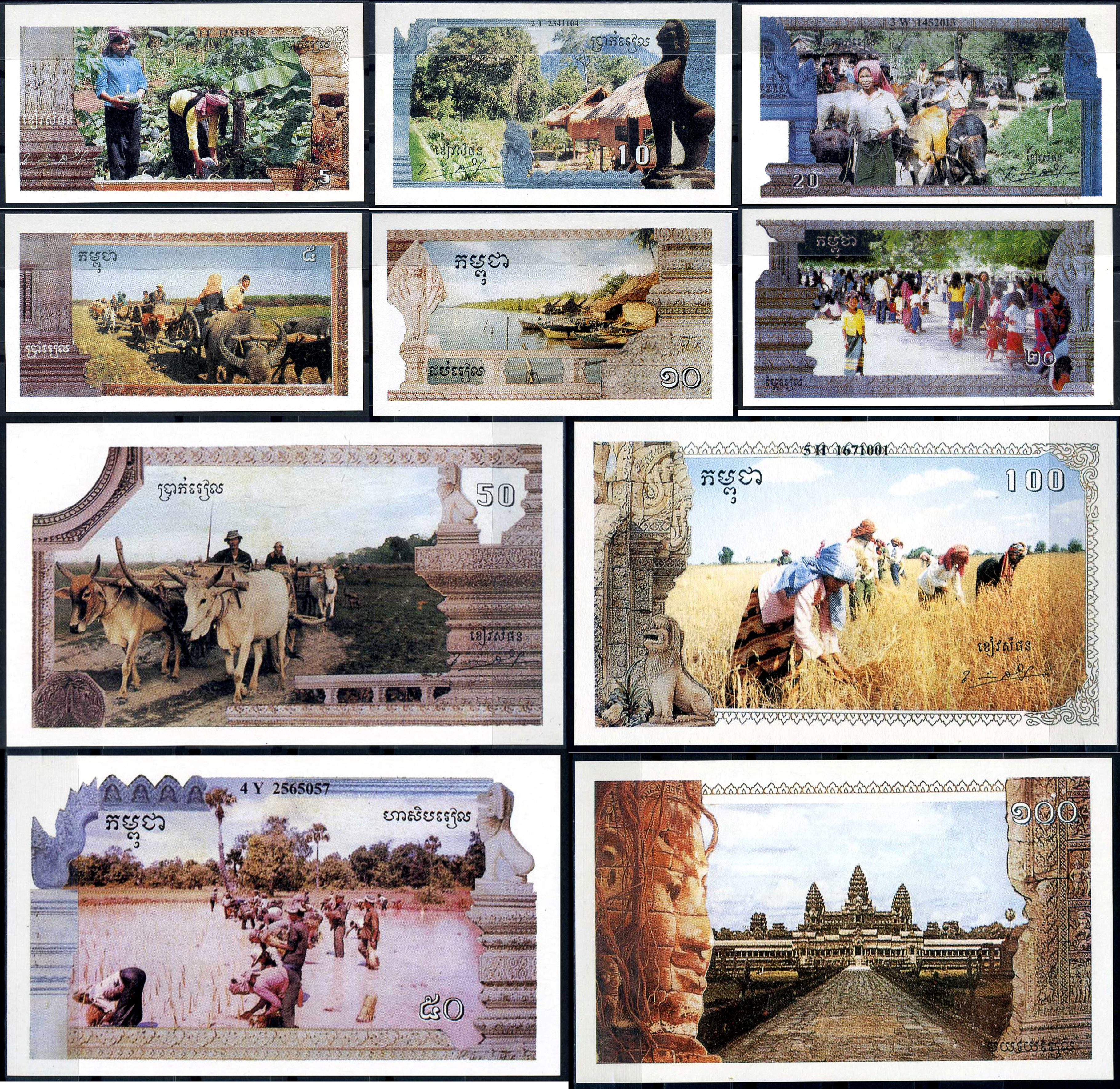 -----Камбоджа 5, 10, 20, 50 и 100 риэлей ND (1993-1999) выпущен для обращения в районах, оккупированных красными кхмерами, в обмен на таиландский бат Pick RX1, RX2, RX3, RX4 и RX5 бумага UNC (пресс) 451-648-1