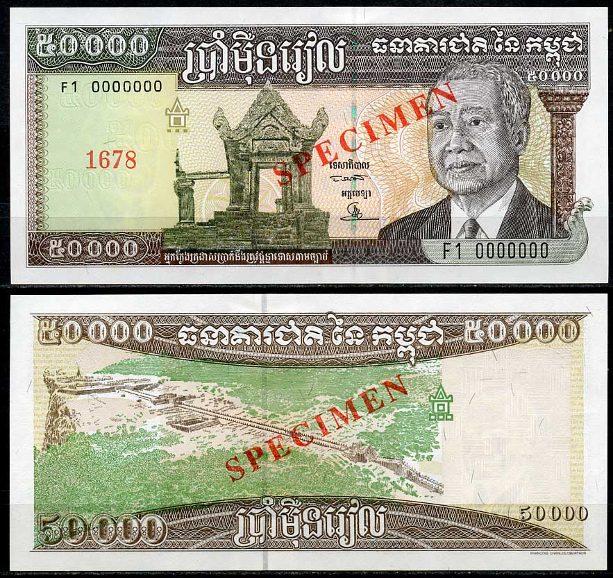 Камбоджа 50000 риэлей ND (1995) Король Нородом Сианук, храм Преах Вихир, образец, specimen Pick 49 a s бумага UNC (пресс) 451-665-3