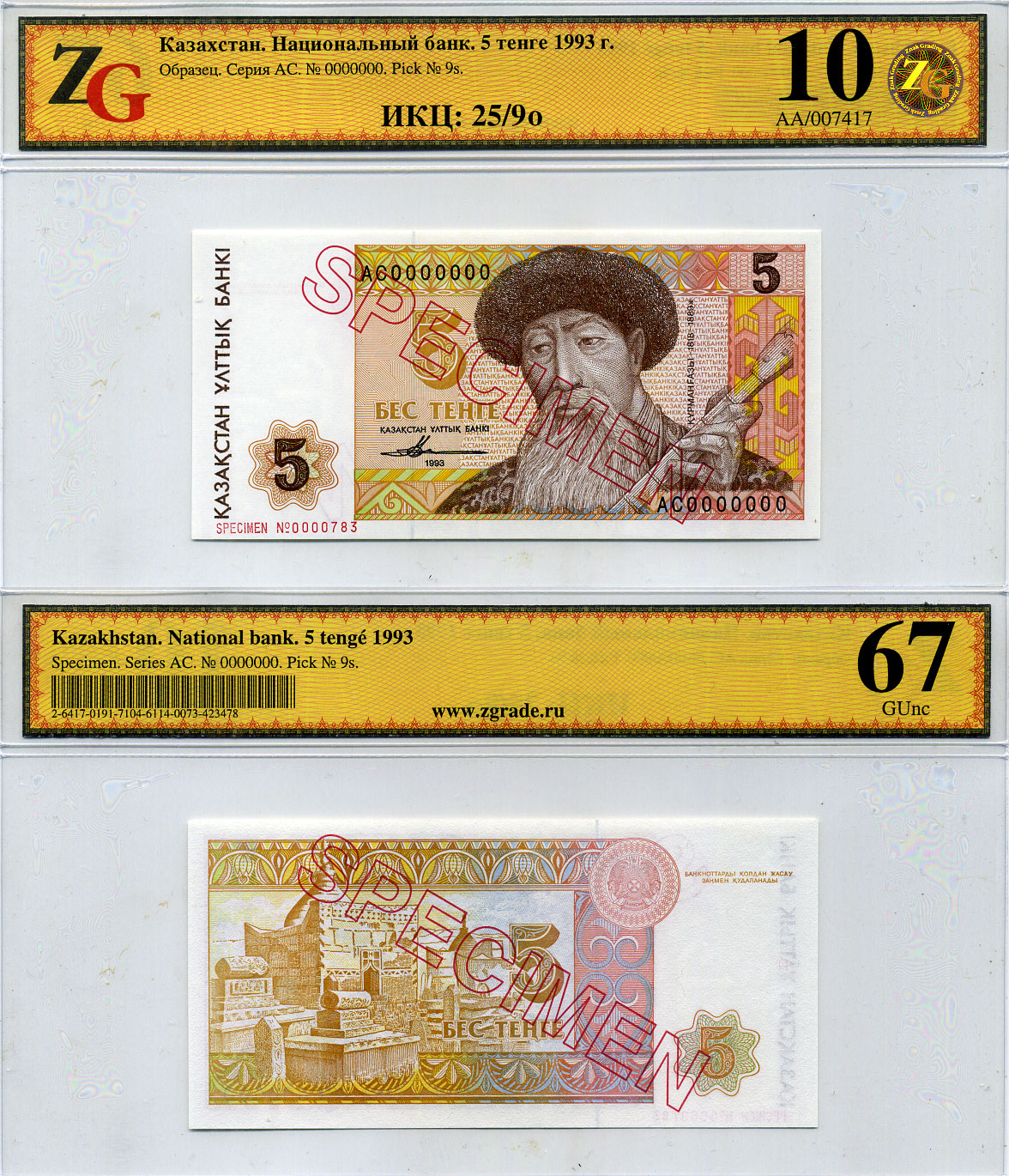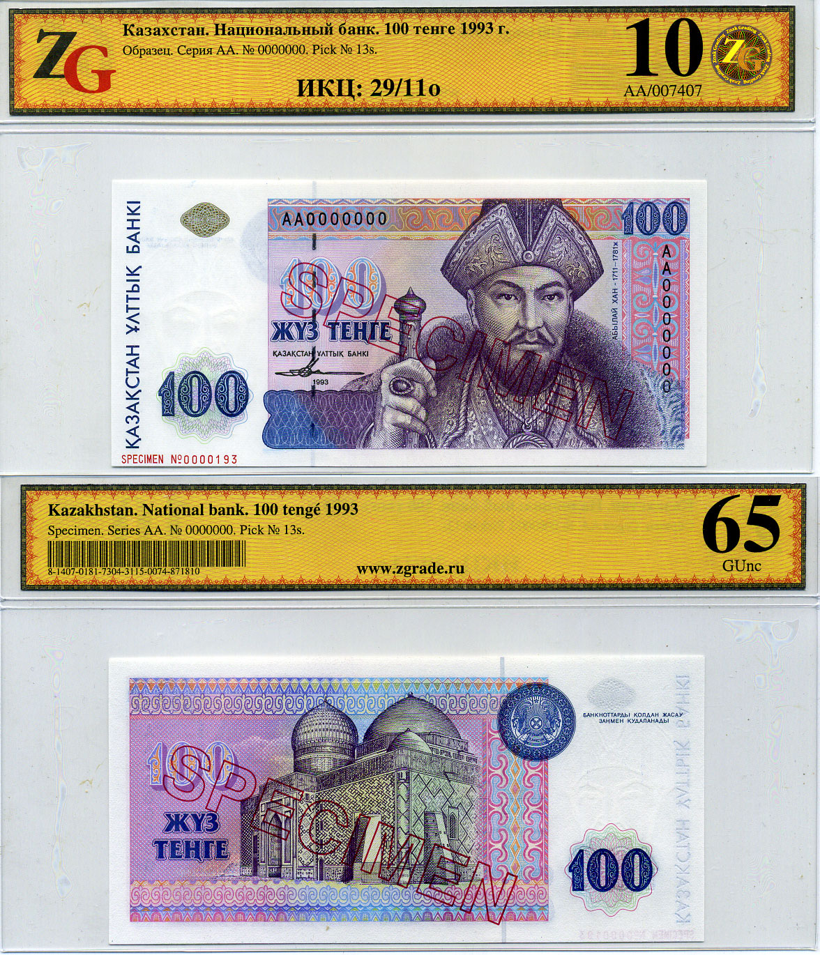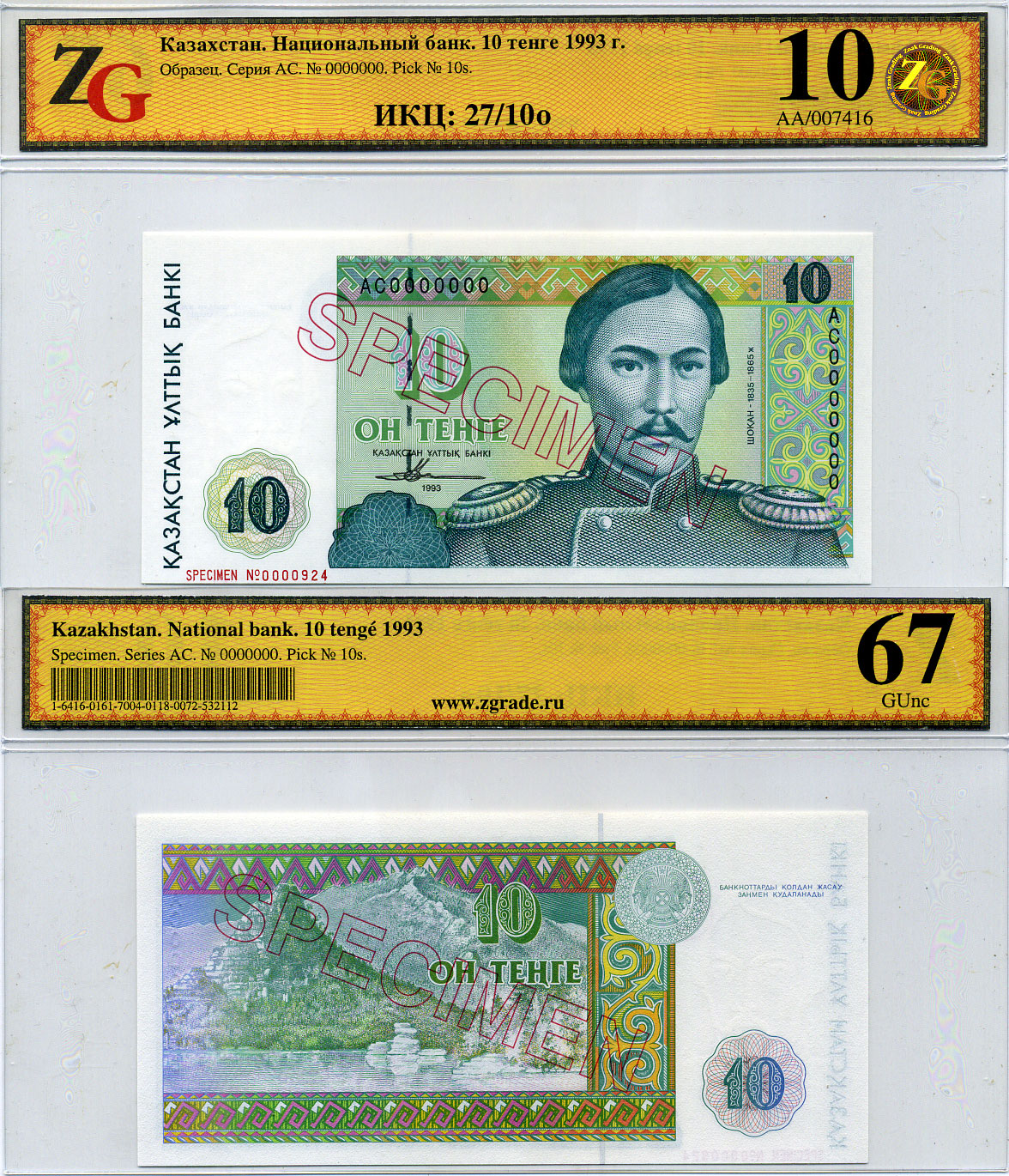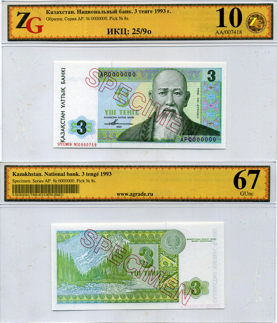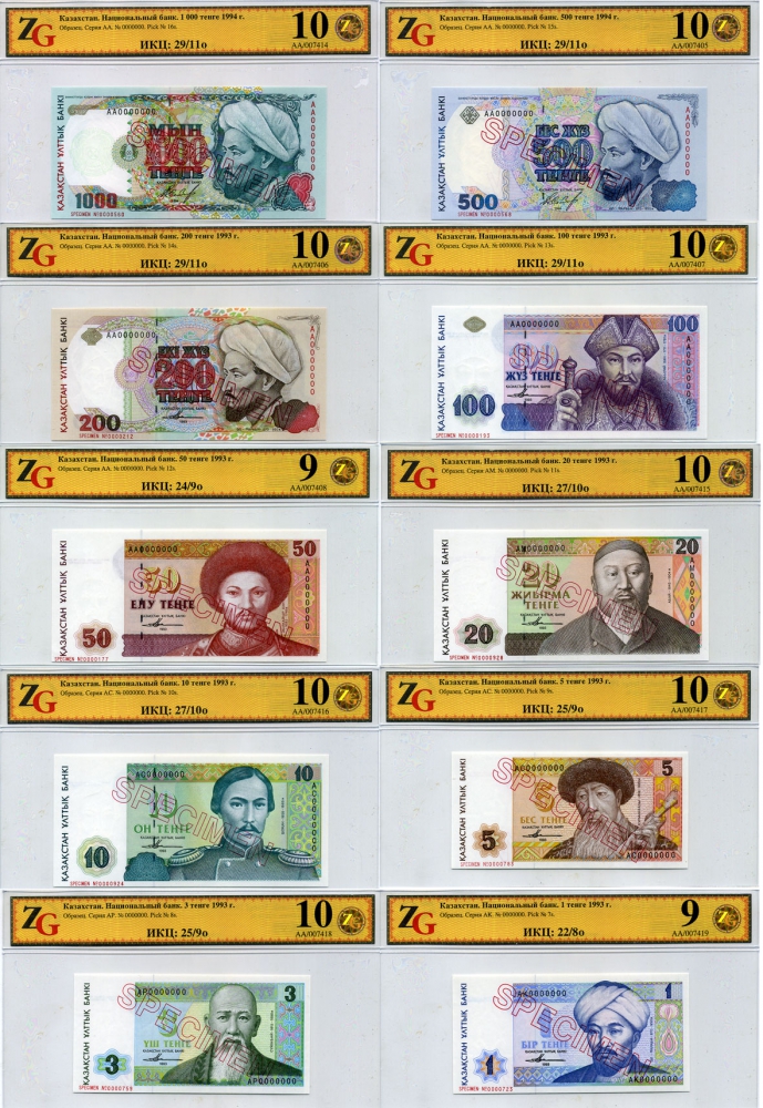 Казахстан набор из 10 банкнот 1993-1994 SPECIMENT, в холдерах компании ZG. Сохранность - 9-10 Pick 7S, 8S, 9S, 10S, 11S, 12S, 13S, 14S, 15S, 16S, Сергеев 7S1, 8S1, 9S1, 10S1, 11S1, 12S1, 13S1, 14S1, 15S1, 16S1 бумага UNC (пресс) 452-1-76