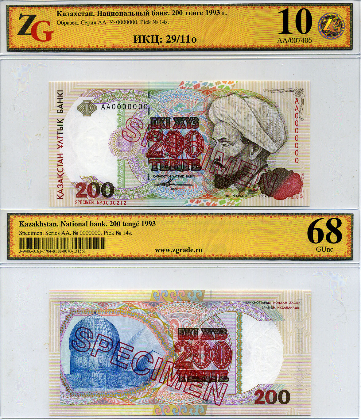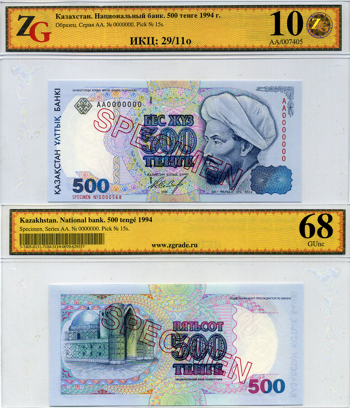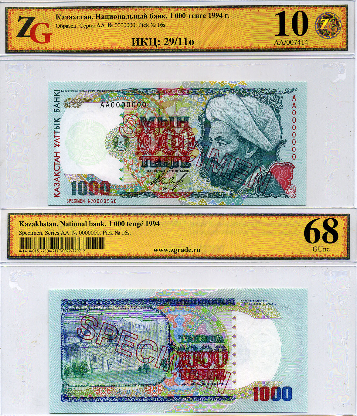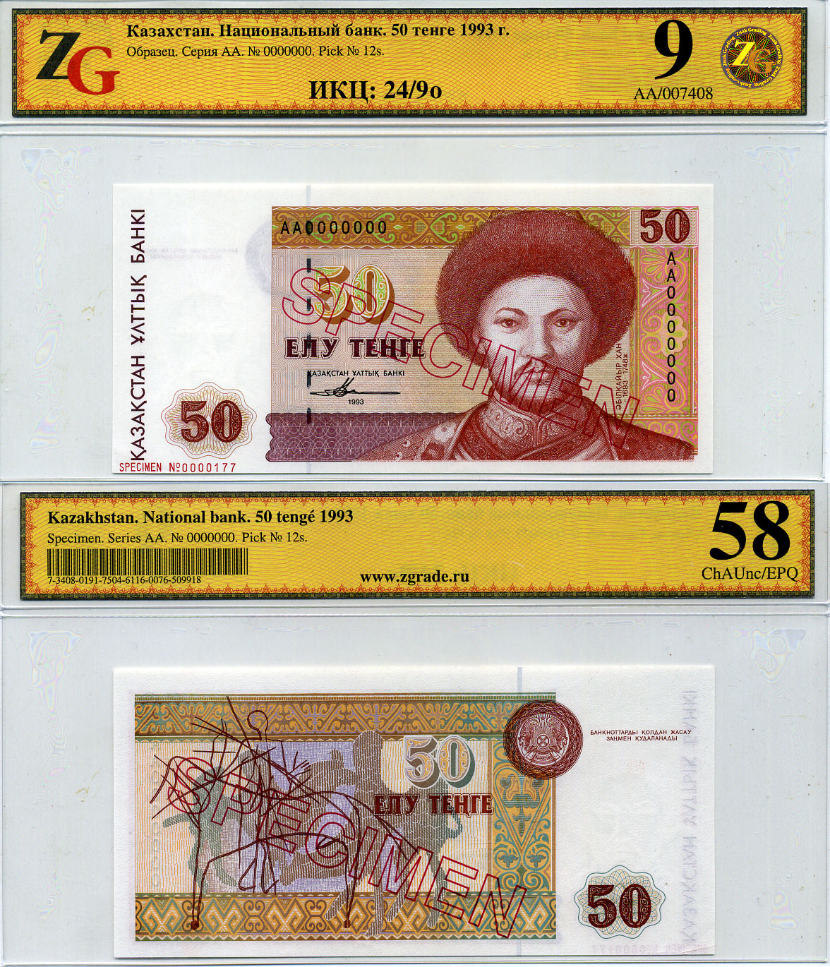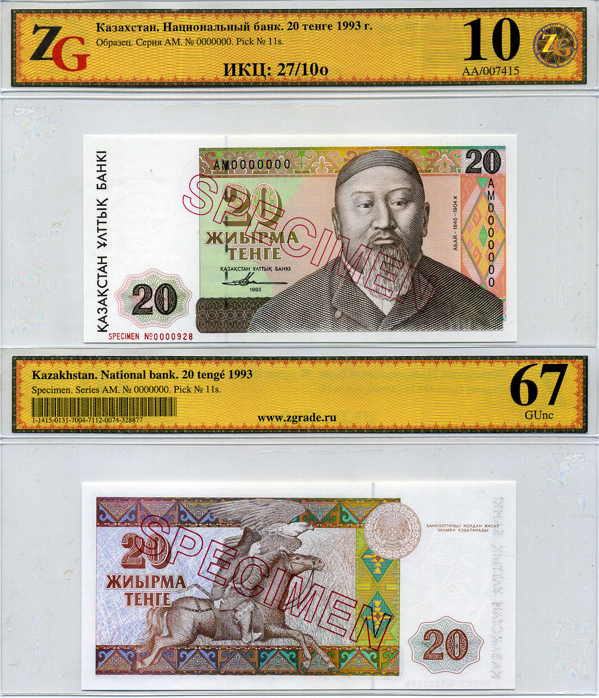 Казахстан набор из 10 банкнот 1993-1994 SPECIMENT, в холдерах компании ZG. Сохранность - 9-10 Pick 7S, 8S, 9S, 10S, 11S, 12S, 13S, 14S, 15S, 16S, Сергеев 7S1, 8S1, 9S1, 10S1, 11S1, 12S1, 13S1, 14S1, 15S1, 16S1 бумага UNC (пресс) 452-1-76