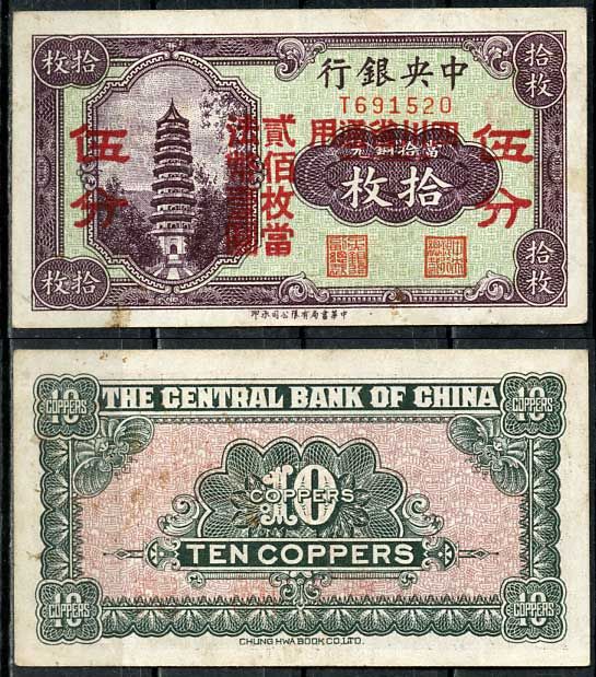 Китай 10 медных монет 1928 Центральный банк Pick 167 b бумага 451-655-4-1
