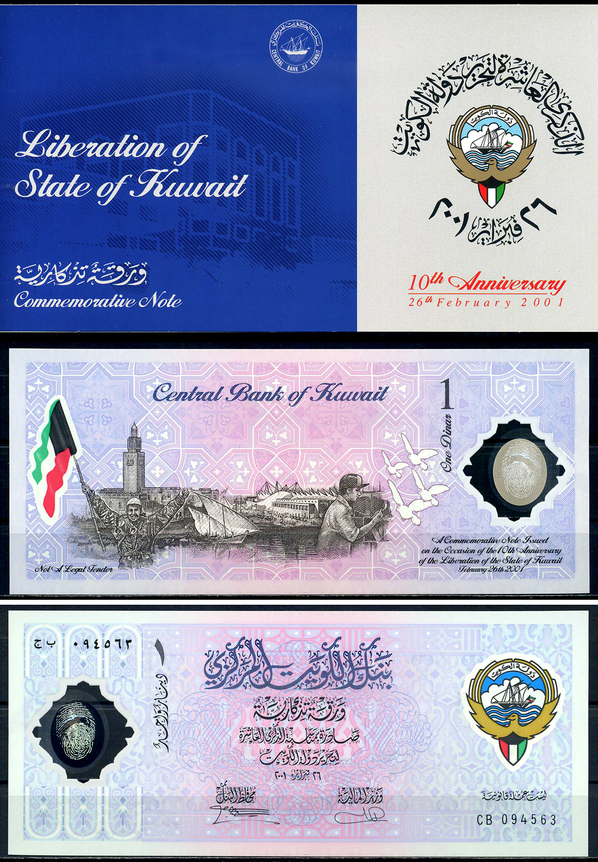 Кувейт 1 динар 2001 10-я годовщина освобождения Кувейта, оригинальный буклет, конверт Pick CS2 пластик UNC (пресс) 446-140-1