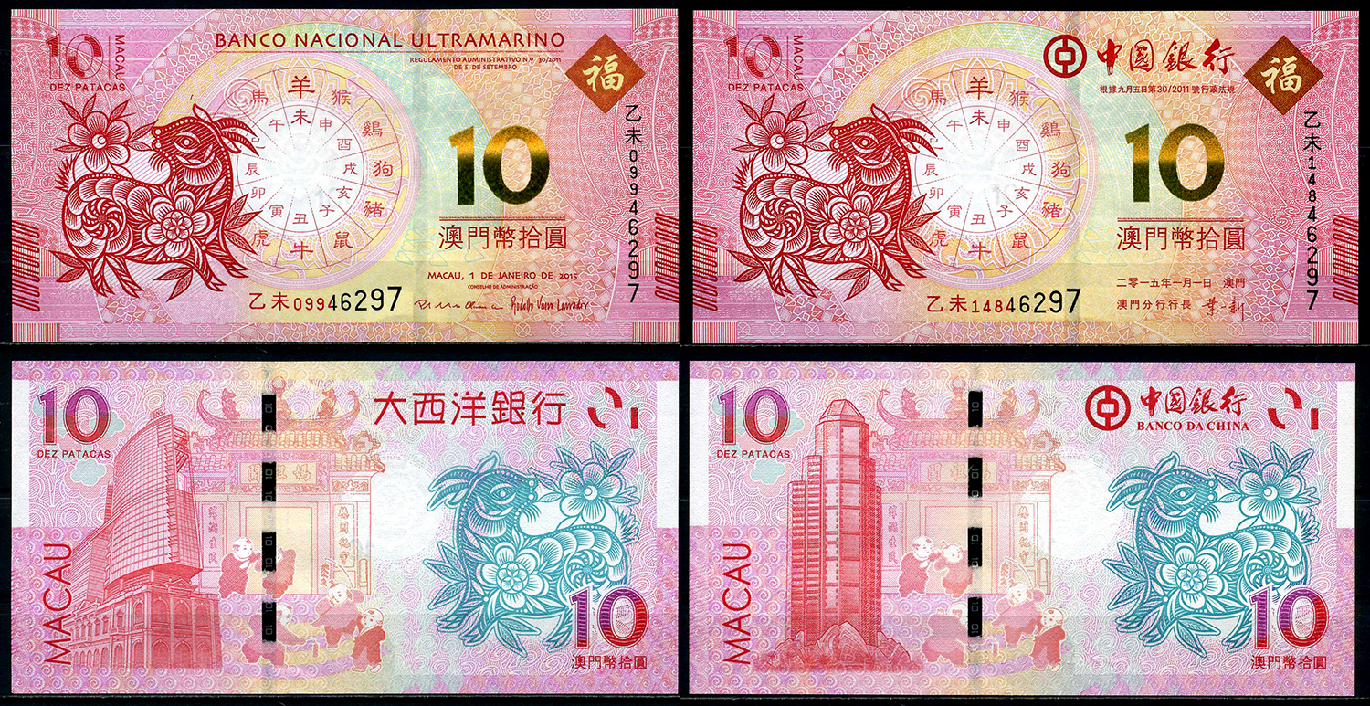 Макао набор из 2 банкнот по 10 патака 2015 год козы Pick 118, 88 бумага UNC (пресс) 446-18-5-2