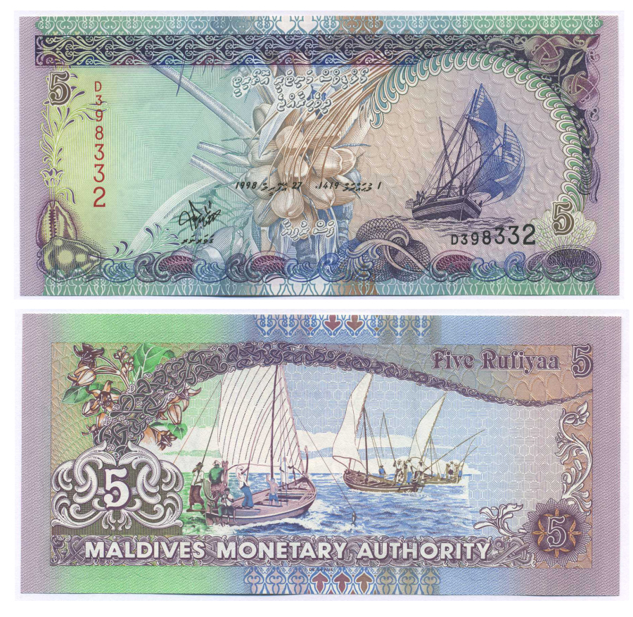 Мальдивские острова 5 руфий 1998 АН1419, парусник Pick 18 а бумага UNC (пресс) 8588-86-2-2