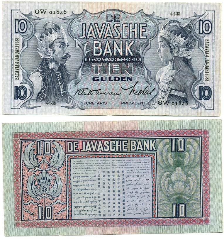 Нидерландская Индия 10 гульденов 1938 Яванские танцоры, 4 января 1938 Pick 79 b, Mev.141 b 000-000-00