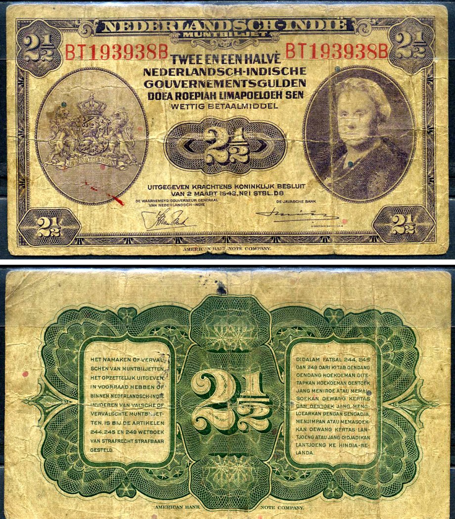 Нидерландская Индия 2 1/2 гульдена 1943 японская оккупация Pick 112 бумага 7548-24-1-2