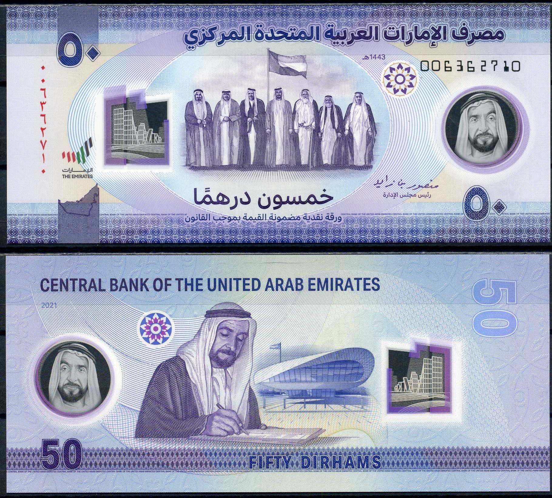 ОАЭ 50 дирхемов 2021 50 лет со дня основания ОАЭ Pick W35 пластик UNC (пресс) 451-697-1