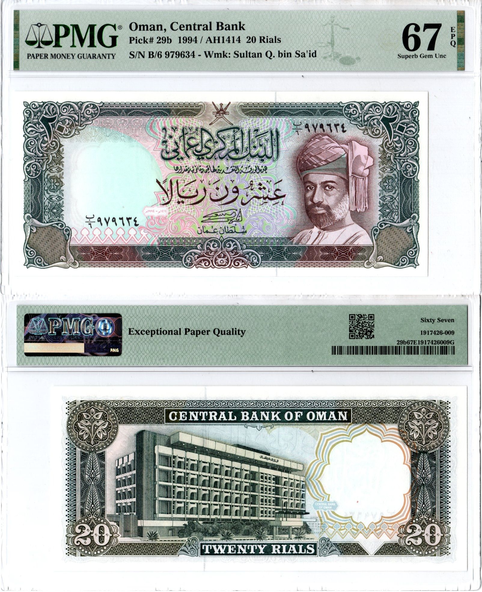 Оман 20 риалов 1994 Султан Кабус бен Саид, здание Центрального банка Омана, Маскат. В слабе PMG 67 superb gem unc Pick 29 b бумага UNC (пресс) 10-2-38