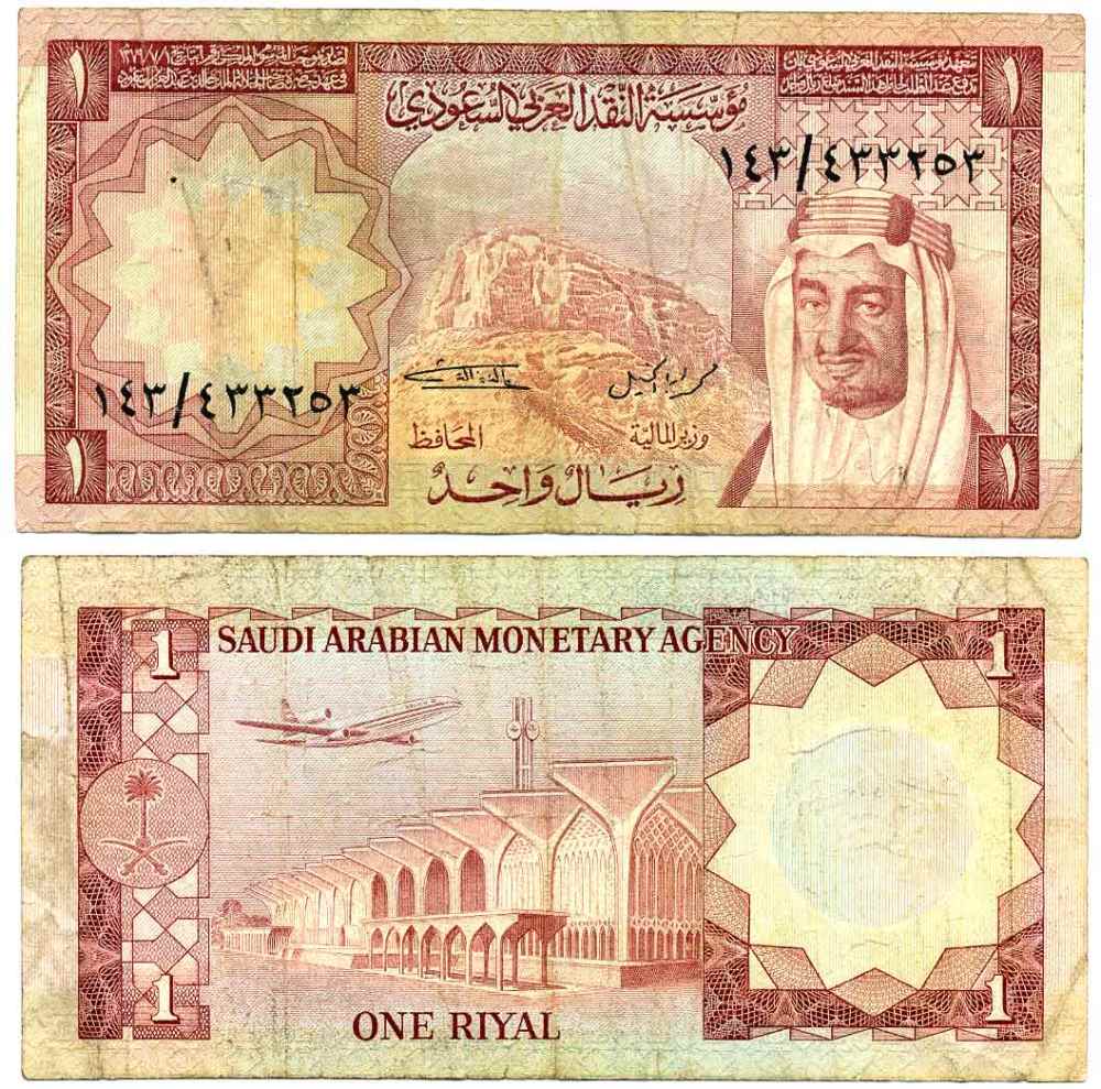 Саудовская Аравия 1 риал 1977 AH 1379, Фейсал ибн Абдул-Азиз, самолет Pick 16 a бумага 7486-36-3-2