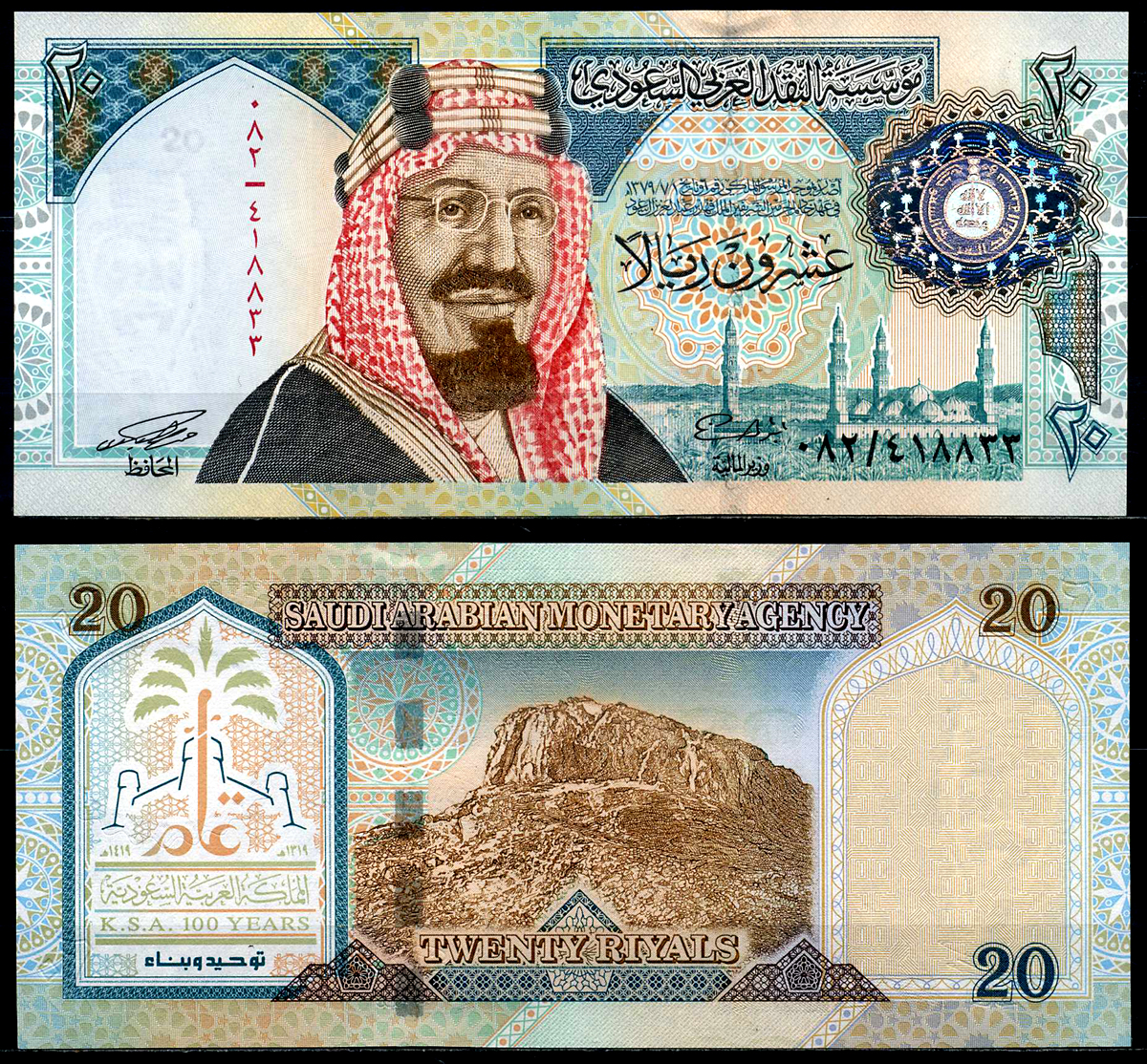Саудовская Аравия 20 риалов 1999 AH 1419, Король Абдул-Азиз ибн Абдуррахман Аль Сауд, медина Pick 27 бумага UNC (пресс) 446-18-6-1