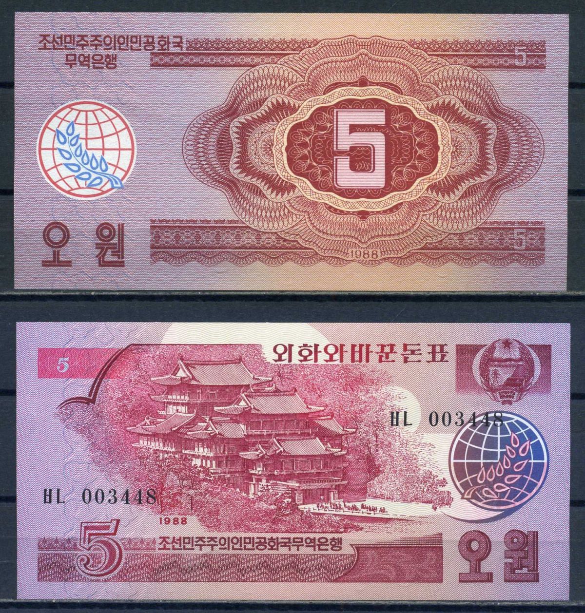 Северная Корея 5 вон 1988 Выпуск для туристов из социалистических стран Pick 36 бумага UNC (пресс) 446-146-3