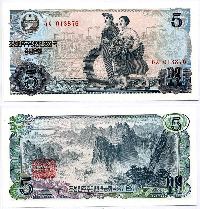 СЕВЕРНАЯ КОРЕЯ 5 ВОН 1978 СЕРИИ КРАСНЫЕ, ПЕЧАТЬ КРАСНАЯ Pick 19с бумага UNC (ПРЕСС) 8615-43-2-1