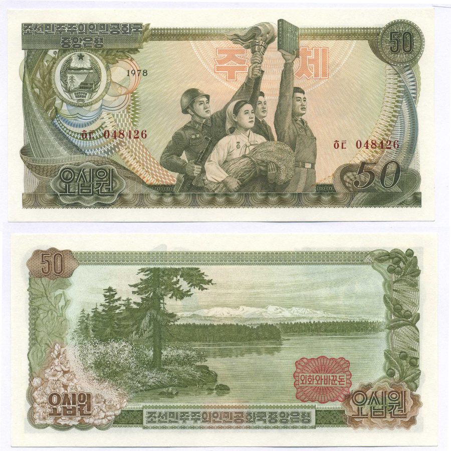 СЕВЕРНАЯ КОРЕЯ 50 ВОН 1978 КРАСНАЯ СЕРИЯ, КРАСНАЯ НАДПЕЧАТКА НА ОБОРОТЕ Pick 21c бумага UNC (ПРЕСС) 7553-18-3-2