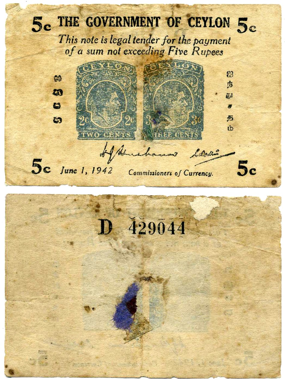ЦЕЙЛОН 5 ЦЕНТОВ 1942 1 ИЮНЯ 1942, БЕЗ ВЕРТИКАЛЬНОЙ ПЕРФОРАЦИИ В ЦЕНТРЕ Pick 42а бумага 451-407-3