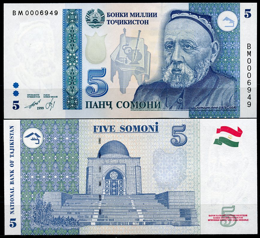 Таджикистан 5 сомони 1999 Садриддин Айни, мавзолей Рудаки Pick 15 c бумага UNC (пресс) 448-25-3