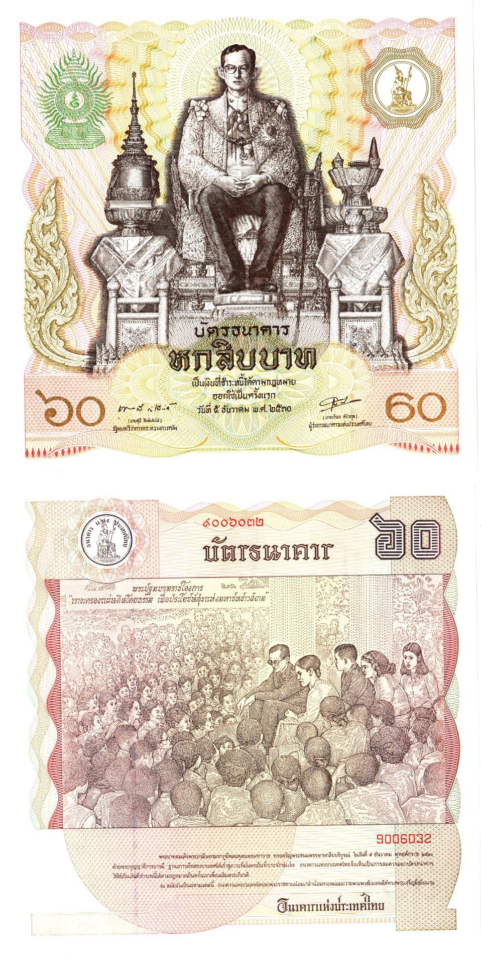 Таиланд 60 батов BE 2530 (1987) 60 лет со дня рождения короля Рама IX Пхумипон, квадратная Pick 93 a бумага UNC (пресс) 7486-76-2-2