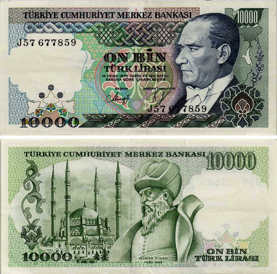 ТУРЦИЯ 10000 ЛИР 1989 ПРЕЗИДЕНТ КЕМАЛЬ АТАТЮРК, МИМАР СИНАН Pick 200 бумага 6281-17-2-1