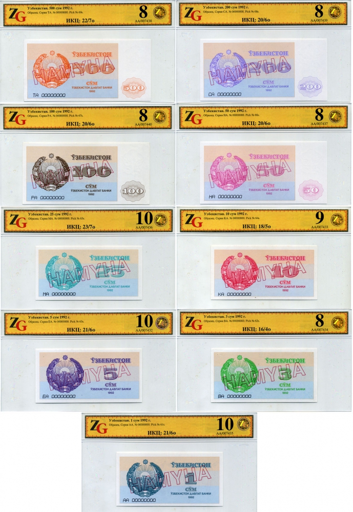 Узбекистан набор из 9 банкнот от 1 до 500 сум 1992 SPESIMEN, HAMYHA, образец, в холдерах компании ZG. Сохранность - 8-10 Сергеев 1S, 2S, 3S, 4S, 5S, 6S, 7S, 8S, 9S бумага UNC (пресс) 452-1-80