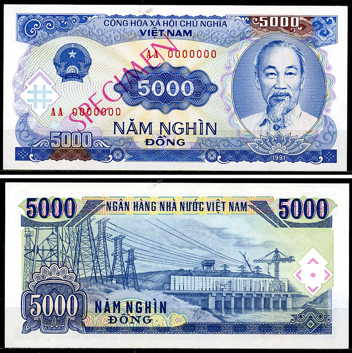 Вьетнам 5000 донгов 1991 образец, Specimen (Tienmau), Хо Ши Мин, ГЭС Pick 108 s бумага UNC (пресс) 451-967-1