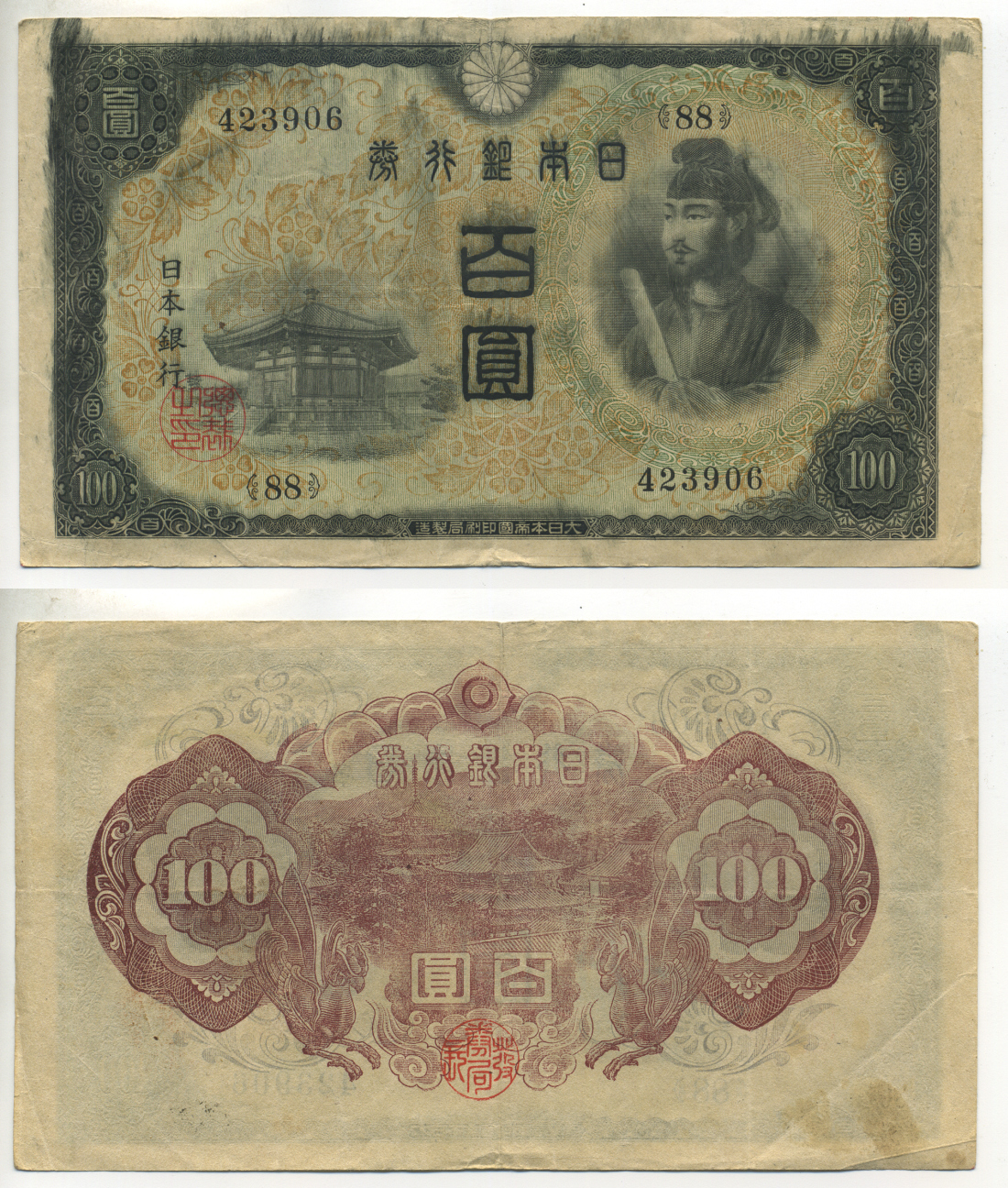 ЯПОНИЯ 100 ЙЕН 1944 ВОДЯНОЙ ЗНАК АРАБЕСКИ, БЛОК 88 Pick 57a бумага 6301-6-4