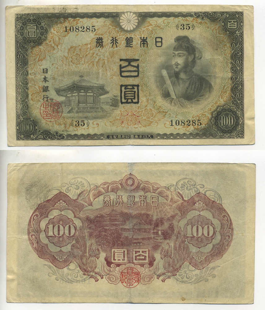 ЯПОНИЯ 100 ЙЕН 1944 ВОДЯНОЙ ЗНАК АРАБЕСКИ Pick 57а бумага 6289-6-2-1
